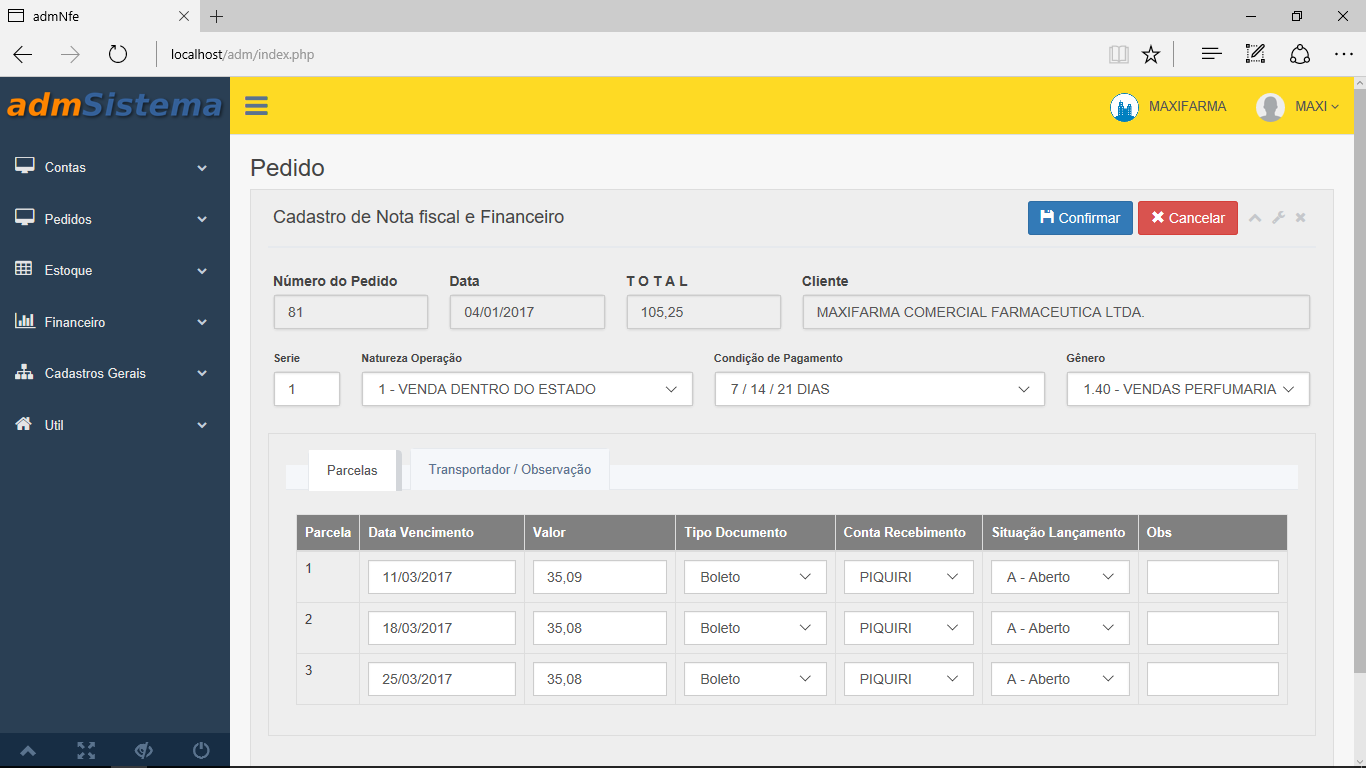 Serviço de emissão de nota fiscal através do pedido, primeiramente é digitado o pedido, o próximo passo é a geração da NFe simplificado, são calculados altomaticamente os impostos, integração com financeiro e estoque se disponível.